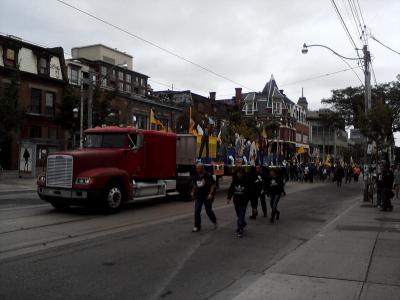 Heute morgen verließ ich das Hostel, um Bargeld wieder zu holen, bin ich genau in einen Umzug gestolpert. Durch nachfragen bei einem Polizisten, erfuhr ich, dass es sich um den "Labour Day" Umzug handelte. An dem Umzug nahmen zahlreiche Menschen statt, die für eine bessere Behandlung für ihren Berufstand eintraten sowie ein paar andere Gruppen, die öffentliche Instiutionen zu einer bessere Situation verhelfen wollten. Ich schloss mich auch kurz einer Gruppe an, die führ die öffentliche Bibliothek eintraten. Danach ging ich zu einer Sightseeingbushaltestelle, denn mein Ticket geht eine Woche und mit dem Bus zum "Royal Ontario Museum". Ich verbrachte einige Zeit dort und schaute mir einige ihrer Ausstellungstehmen an, denn alle auf einmal wär doch ein bisschen viel. Das Museum hat nämlich vier gut bestückte Etagen voll von unterschiedlichsten Themen und ich ging nur durch zwei Etagen, die allerdings sehr interessant waren.